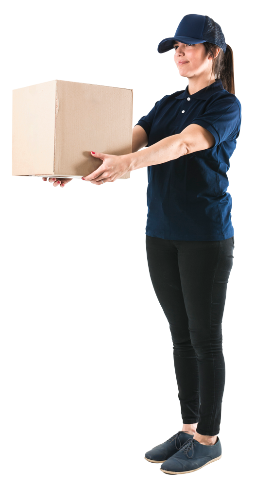 Un livreur ou livreuse en uniforme, avec son propre véhicule ou un véhicule bien identifié : Macro Transport